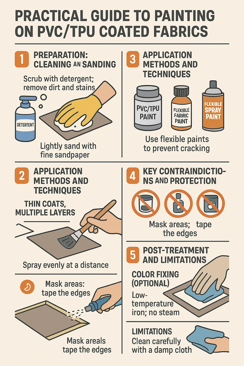 در اینجا یک راهنمای عملی برای نقاشی کردن وجود دارد پارچه های روکش پی وی سی و پارچه های با روکش TPU، که شامل تجربه و اقدامات احتیاطی رایج است: