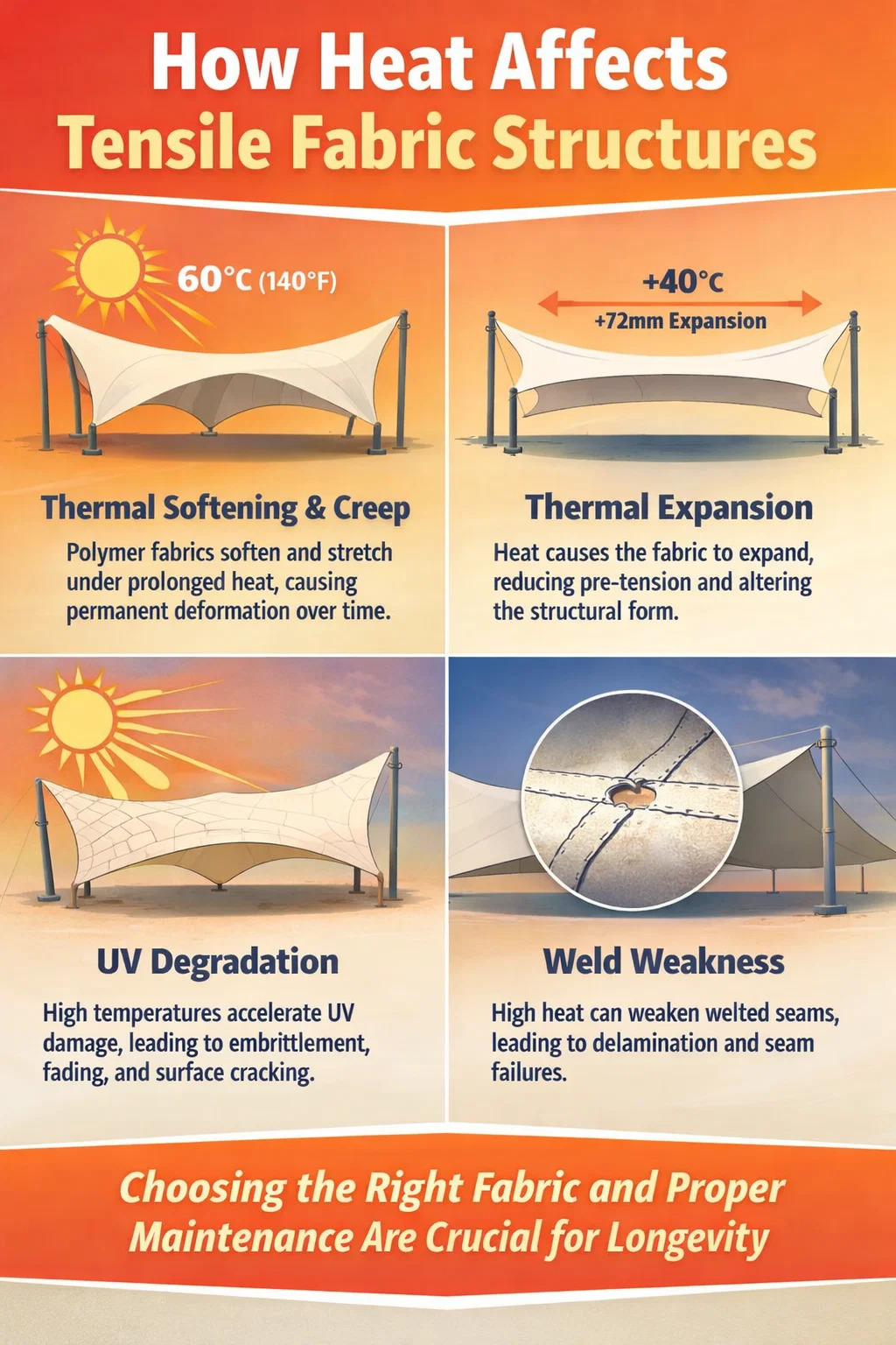شایع ترین شکست ناشی از گرما در سازه های پارچه کششی PVC در خود غشا نیست بلکه در درزهای جوش داده شده است. جوشکاری با فرکانس بالا یا جوش گرم، پی وی سی را به پی وی سی فیوز می کند، اما ناحیه جوش ذاتا ضعیف ترین نقطه در مجموعه غشا است. در محیطهای پایدار با دمای بالا، بهویژه جایی که سازه با بارگذاری باد خم میشود، جوشهای ضعیف اجرا شده میتوانند لایه لایه شوند. تعیین حداقل همپوشانی درز 40 میلی متر و استحکام پوسته جوش بیش از 150 نیوتن / 5 سانتی متر تست استاندارد EN ISO 1421 یک معیار کیفیت معقول برای کاربردهای آب و هوای گرم است.