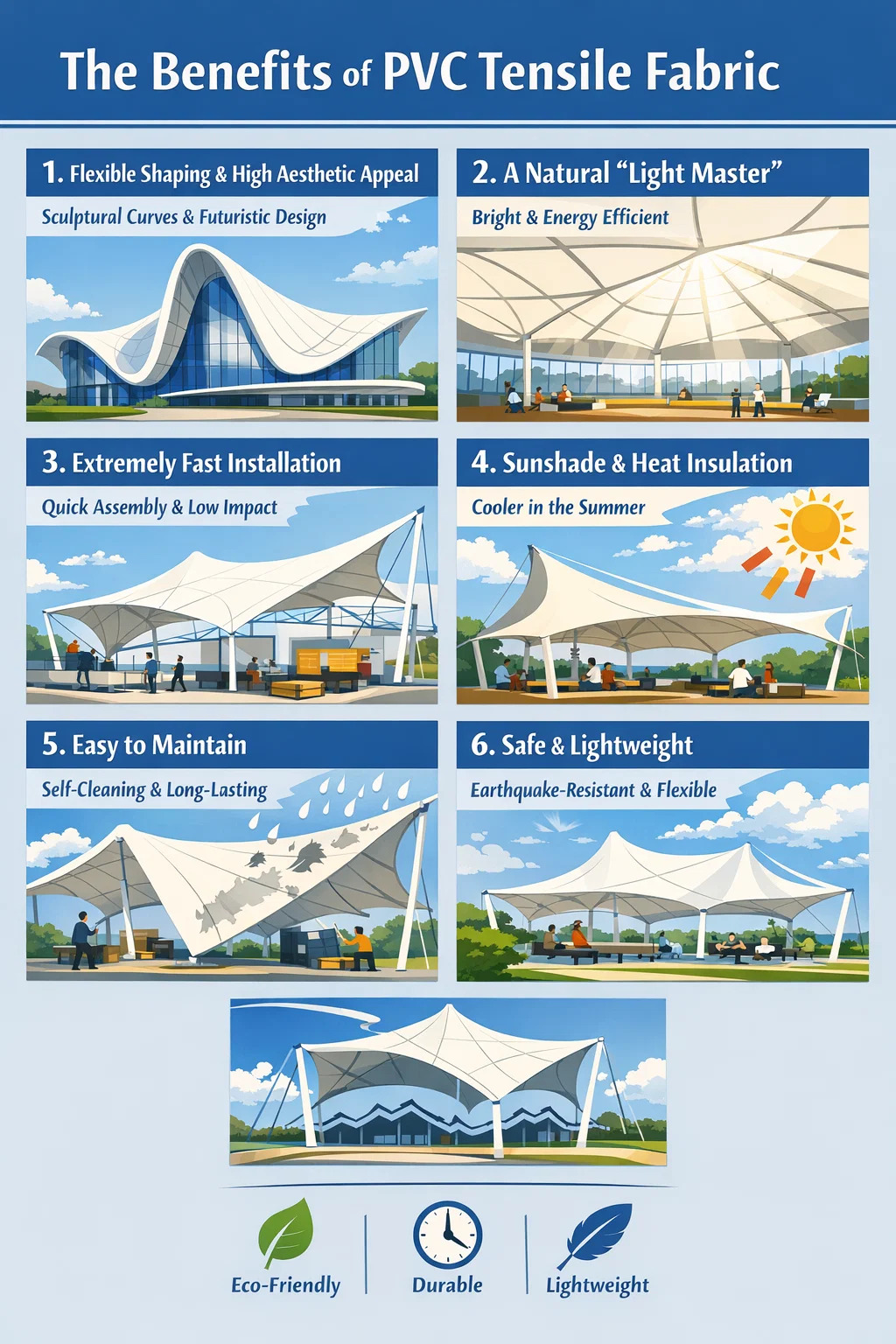 صحبت از مزایای پارچه کششی پی وی سی محبوبیت آن در معماری مدرن، به ویژه در استادیوم ها، میدان های فضای باز، و سایه زنی مناظر، از مزایای منحصر به فرد بسیار آن نسبت به مصالح سنتی ناشی می شود.