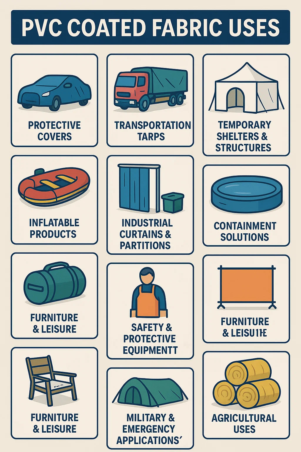 در اینجا یک تفکیک از کاربردهای رایج برای پارچه روکش پی وی سی ، منعکس کننده کاربردهای عملی آن: